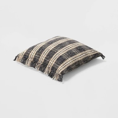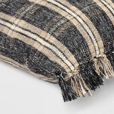Give a cozy cabin look to your bedroom or living space with the Woven Plaid Square Throw Pillow from Thresholdâ˘. Made from a soft fabric with comfortable filling, this square throw pillow is adorned with a plaid pattern in shades of black, cream and beige, and features matching fringed trim on the two sides for added flair. Whether you lounge in your favorite recliner, read a book on the couch or watch TV curled up on your sofa, you’ll love leaning on this versatile checkered pillow.